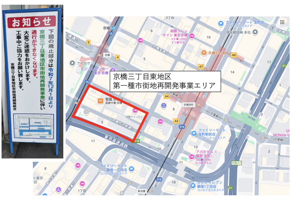 京橋三丁目東地区第一種市街地再開発事業に伴い、12月1日からエリア内の道路の通行ができなくなるとのお知らせが表示されました。 通行できなくなる道路のうち、区道の詳細については中央区の「令和7年度第6回庁議(令和7年5月27日) ⑤/ 決定事案」をご参照ください。 区道の路線の廃⽌・変更及び区域変更が行われ、道路部分だった箇所も含めて今後再開発が行われていきます。 路線の廃⽌等に伴う権利変換による資産については、築地川アメニティ整備構想など区の将来を担う重要な都市基盤整備へ今後活用していくため、中央区⾸都⾼速道路地下化等都市基盤整備基⾦等に積み⽴てるとのことです。 建て替え等で建物がなくなると以前は何があったかすぐに忘れてしまうので、写真を撮っておくことにしました。