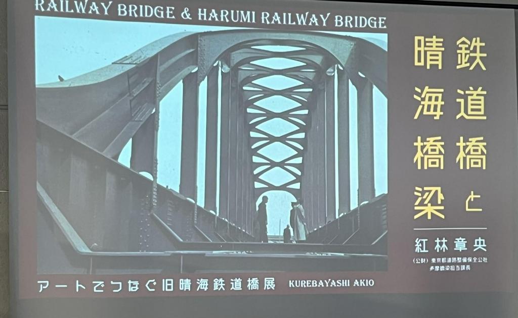 前回、表題のイベントの展示内容について、紹介しました。まだ読んでないお友達は先にこちらの前編を読んでね。まあ、今回のPart2から先に読んでもいいけど。 2025年12月5日~14日で開催されていたイベント最終日の前日、12/13の13時からゲストトークに参加したので、今回はその様子をレポートします。 タイトル:「鉄道橋と晴海橋梁」スピーカー:紅林章央氏(くればやし・あきお)(東京都道路整備保全公社道路部多摩橋梁担当課長)聞き手:藤間さちお氏 会場は、前編同様豊洲シビックセンター1Fギャラリーで、展示エリアの奥に特設ステージ。座席数は20名程度でしょうか。 内容は、ざっくり、晴海鉄道橋の製作時の様子、日本全国の橋梁を紹介でした。この記事で全て紹介する大変なことになるので、前半部分だけの紹介です。 会場に投影されたスライドの写真を抜粋して紹介します。もちろん写真撮影OKだったので、投影されたスクリーンを撮影してます。 特派員ブログは掲載する写真の枚数の制限のお達しが設けられてますが、今回写真が全て&文章少な目なので、上限突破を認識しつつ投稿します。 ※今回も、イベント終了時に紅林氏及び藤間氏に記事に掲載の許諾を得てます。