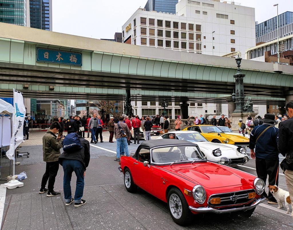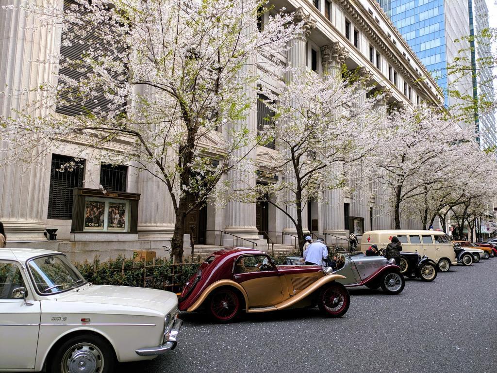 江戸桜通りでは、咲き誇る桜とクラシックカーの優雅な姿の情緒ある風景も。