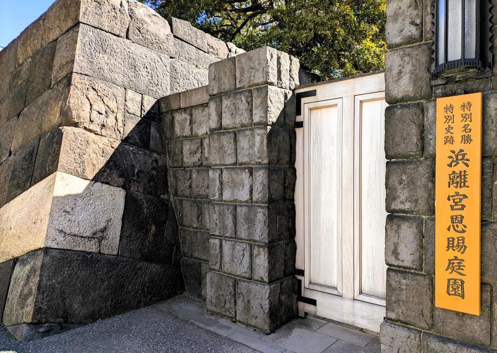 江戸時代には、江戸城の「出城」として役割を果たしていた浜離宮恩賜庭園です。大手門橋を渡ると枡形虎口と石垣があり、他の大名庭園にない、お城の入り口と同じ構造です。渡櫓門であった石垣が残されています。