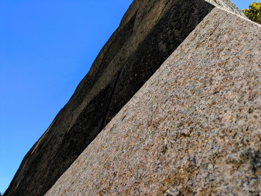 石垣表面は、まんべんなく細かくノミで打ち欠く「はつり仕上げ」の化粧や「江戸切り」と呼ばれる作り出しも確認できます。門前は人が通るところですので手抜きがなく、優美さを兼ね備えた石垣です。