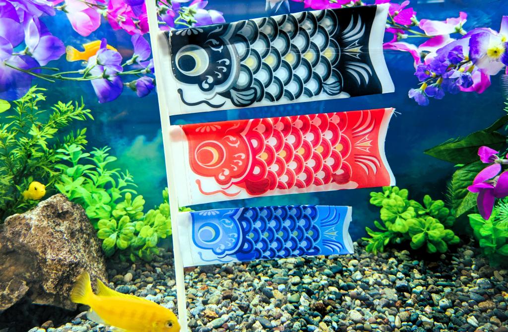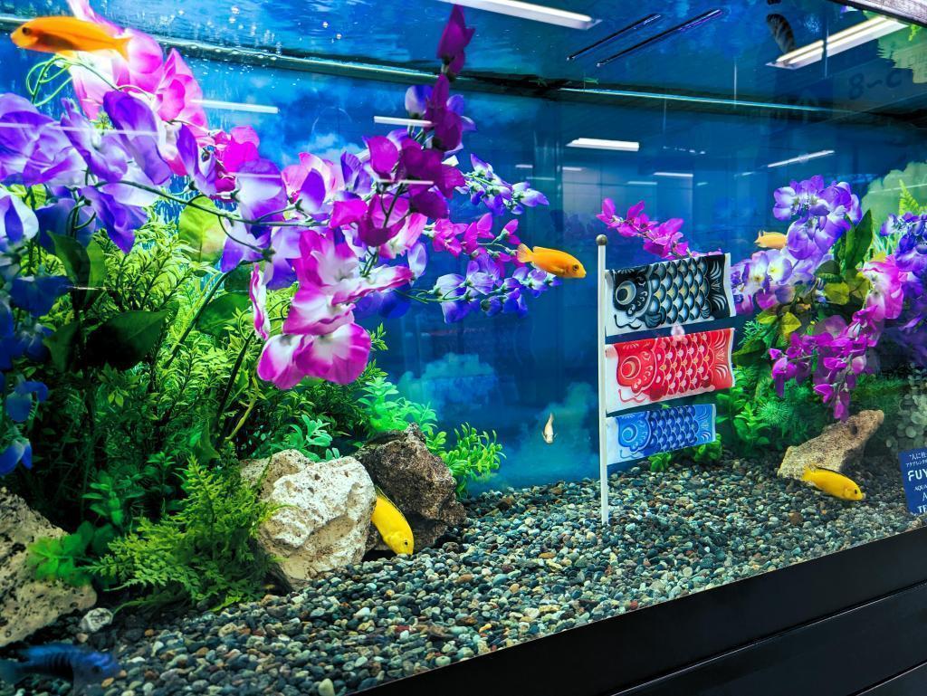 駅改札前の水槽では、滝のような藤の花が見られ、綺麗な熱帯魚といっしょに鯉のぼりも泳いでます。