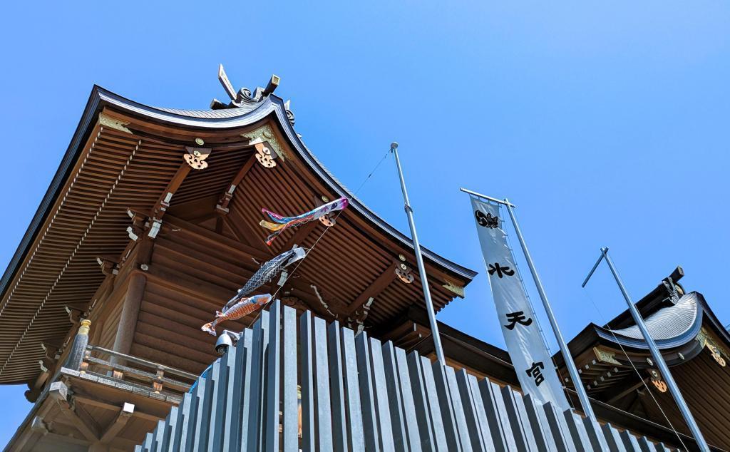 水天宮境内の鯉のぼりは、春の日差しを受けながら気持ちよさそうにそよいでいます。