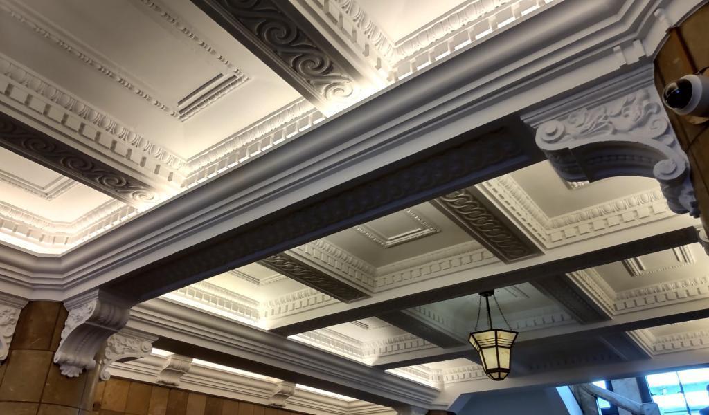 天井の構成を白でまとめたことにより、ガス灯を思わせる灯具と相まって、広がりと軽やかさを演出しています。