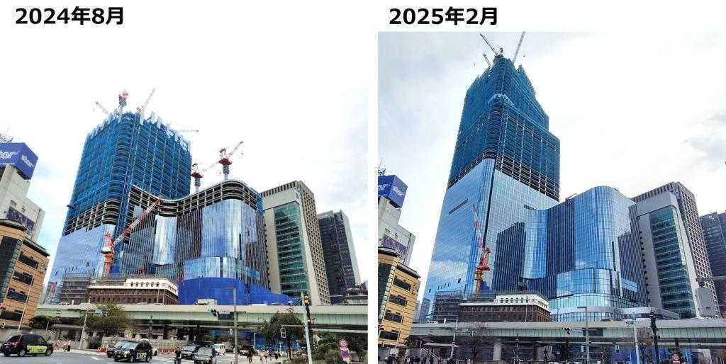 左は2024年8月時点、右が2025年2月時点の写真です。隣に建つ高さ120.8mのコレド日本橋の白いビル(日本橋一丁目ビルディング)と比べると、高さは2倍以上、もう250mは超えているようです。