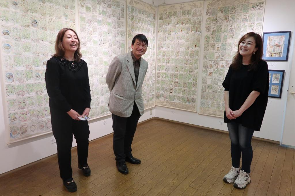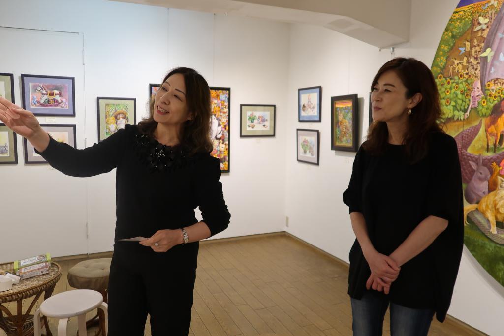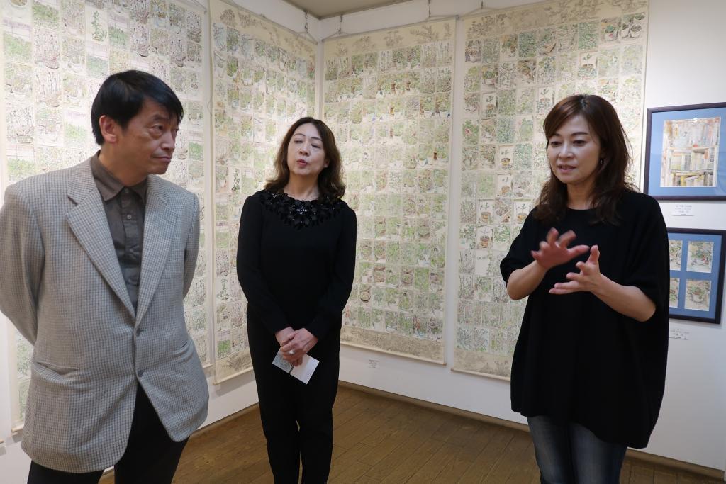 取材当日は、会期最終日。ご夫婦で絵をかいている結城 智子さんと中嶋 修さんもあかね画廊にいらっしゃいました。結城 智子さんは「私の好きな物たち」というテーマで、身の回りの愛してやまない品々を中心に描かれました。中嶋 修さんは「身近な毎日」といテーマで草木や生活を描いています。ご夫婦そろっての展示会は久しぶりとのこと、いろいろとお話を伺ってみました。