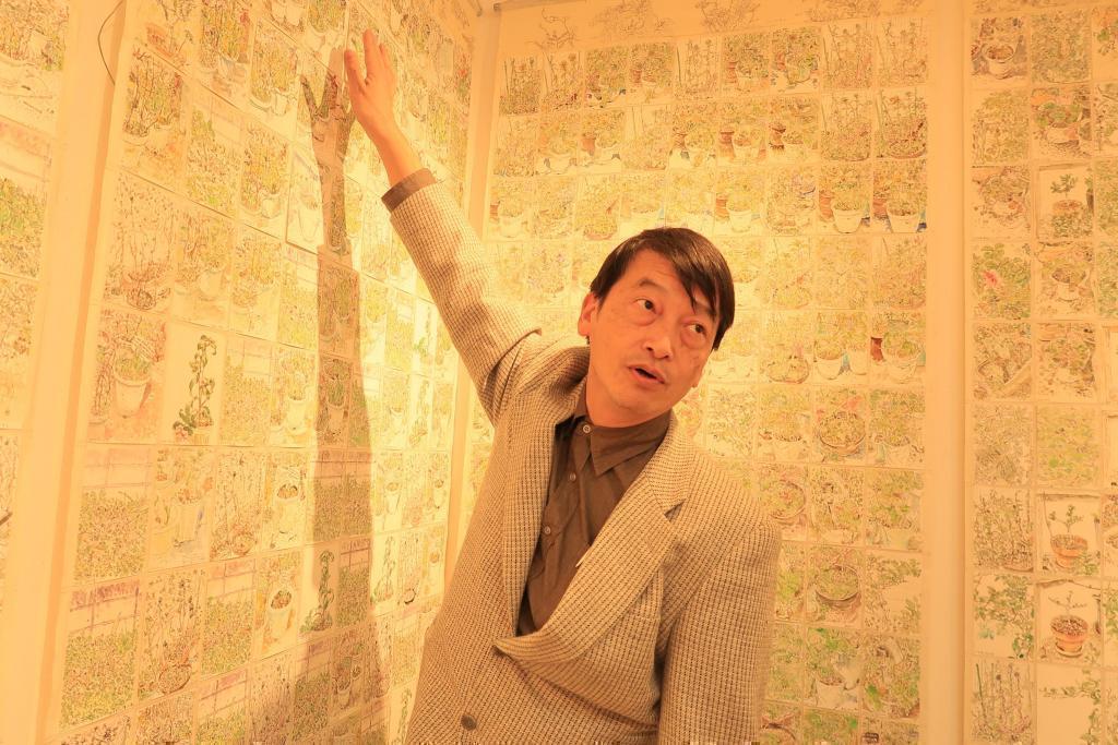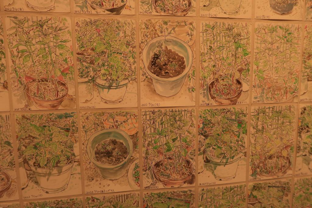 中嶋さんがまず説明してくださったのは、植物の観察日記。日々の植物の成長の記録を毎日異なる時間帯で描かれたと言います。絵によって日差しの強さ、影の様子、天候で絵が変わるそうです。植木鉢がいろいろあるので、多い日は3枚描き、書かない日もあるとのこと。つぼみが咲いて、花になって、実になる様子が中嶋さんの絵から読み取れました。一枚の絵はハガキくらいの大きさですが、大きな紙(縦220cm × 横97cm)に一枚一枚貼って108枚が一つの作品になっています。
