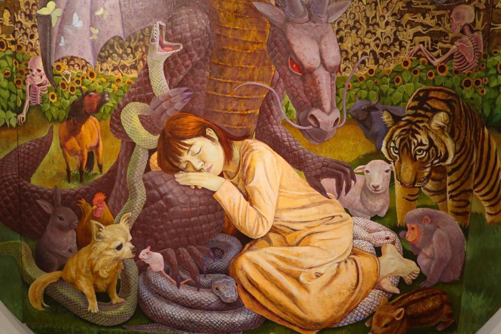 この作品は結城さんがロシアのウクライナ侵攻を題材に描いた絵です。ひまわりの花はウクライナを代表する花。苦しんでいる人や、戦車も描かれています。骸骨は亡くなった人の魂だそうです。絵には十二支が描かれていて、それぞれの動物たちには、それぞれ意味があるようです。結城さんは「力を結集して早く平和を」とおっしゃっていました。とても大きな丸い絵(160×260cm)ですが展覧会を目標に2か月間くらいで集中して描いたとお聞きしました。