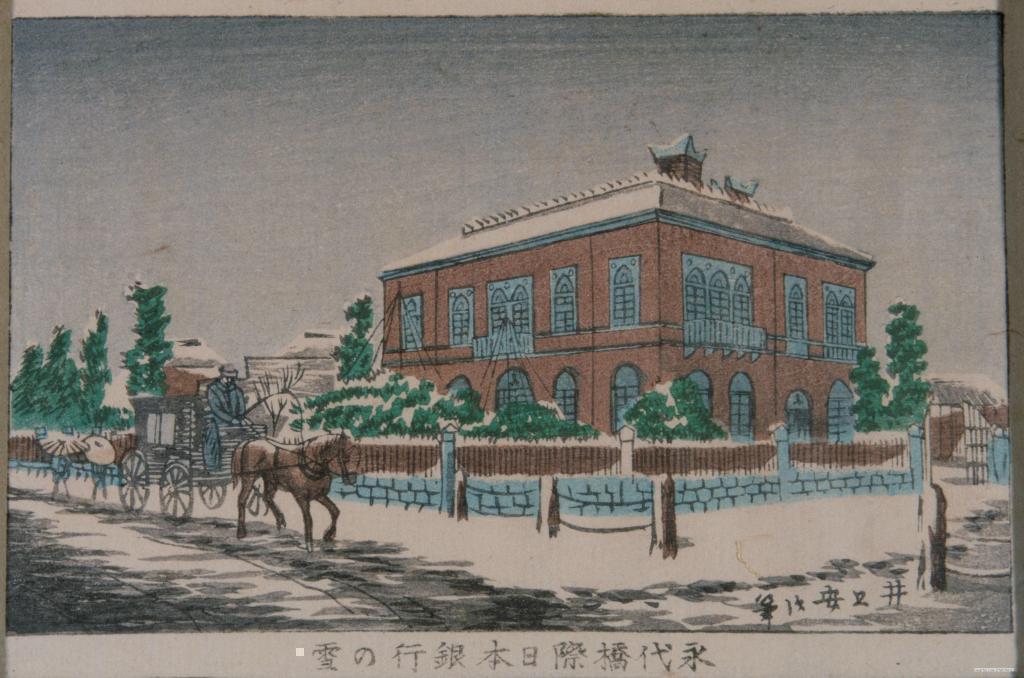 創業当初の日本銀行は、明治15年の創業以来、永代橋そばの日本橋区北新堀町(現在の日本橋箱崎町)にありました。現在は、創業当初の日本銀行の跡地、日本橋川の最下流にかかる豊海橋そばの箱崎側の歩道脇の植え込みに、創業時の日本銀行の建物を描いたプレートがはめ込まれた「日本銀行創業の地」の記念碑があります。創業当時の建物は、井上安治による浮世絵「永代橋際日本銀行の雪」(写真)にも描かれており、この浮世絵は、日本銀行向かいにある貨幣博物館の「春爛漫!桜咲く錦絵」展で展示されています。