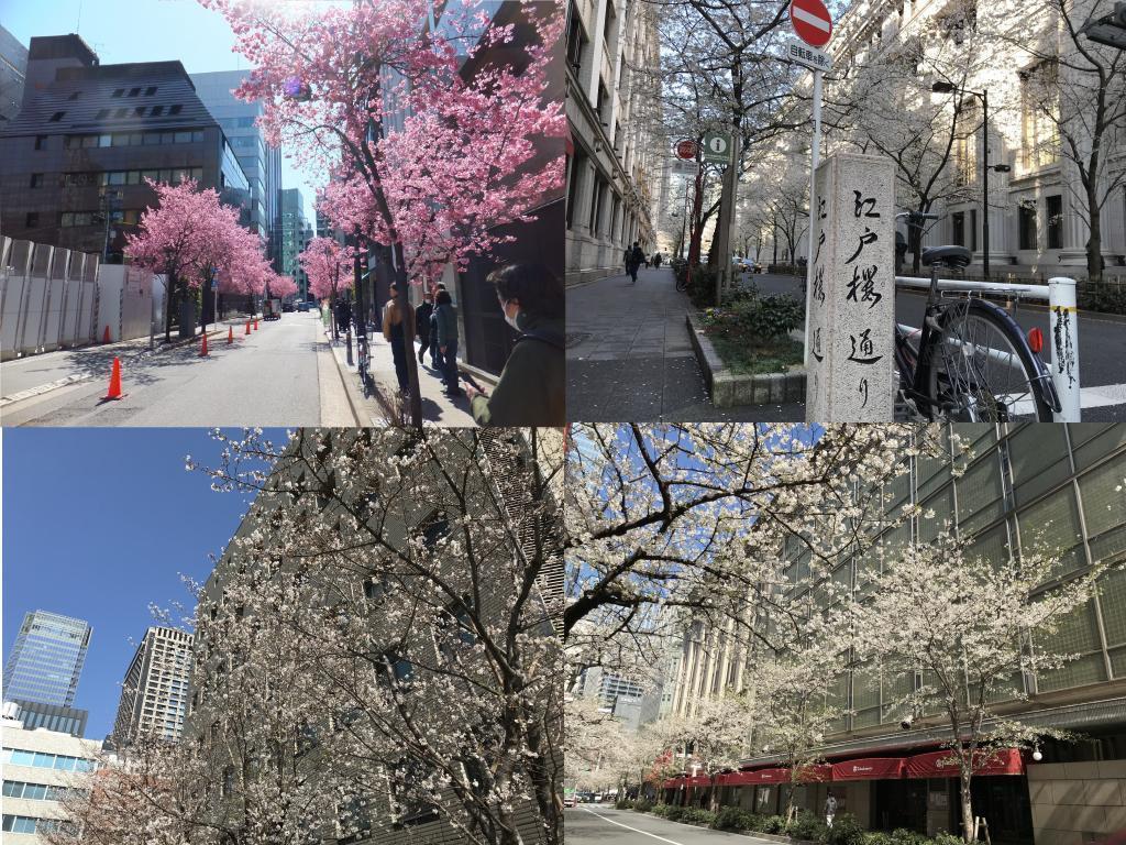 ④日本橋本町室町本石町界隈(左上):オカメザクラが中央区で最初に咲き、3月に桜を満喫できます。すでに散っていたため、3月に撮った写真を掲載します。オカメザクラ・アマノガワ約270本。