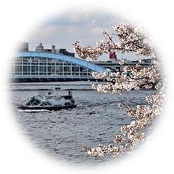 東京都心の桜は、3月24日に開花宣言が報じられ、月末にかけ3度の夏日を記録するなど汗ばむ陽気が続き、30日に平年より1日、昨年より5日早く満開を迎えましたが、その後一転して寒の戻り(所謂 "花冷え")や小雨が降り続くぐずついた天気にも見舞われ、心持ち開花期が長引き、長く楽しめた印象です。 桜の咲く時期の曇った天気のことを「花曇り」、降る雨を「桜雨」「桜流れ」と呼び、言葉自体は情緒がありますが、やはり青空に映える桜色は春を待ち焦がれた感情が満たされ魅了されます。 近年こうした寒の戻りや天候不順に加え暖冬で休眠打破が不十分だった可能性等々で、開花後も一気に咲き揃うに至らず、蕾、開花、葉桜が混在する所謂 "まだら咲き" 傾向が散見されます。 隅田川が中央大橋上流の佃2丁目付近で東に分流した隅田川派川(晴海運河)沿いに立地し、上下2段の遊歩道を有し、親水エリアでは水と触れ合える石川島公園の桜並木も咲き揃い、週末には大勢の花見客で賑わっています。 東京都公園協会の水辺ラインの「さくら」「あじさい」「こすもす」や、東京都観光汽船 東京クルーズの宇宙船をイメージしたシルバーメタリックの流線形ボディの「ヒミコ」「ホタルナ」「エメラルダス」、船体が赤紺白の「竜馬」、緑白の「道灌」など "花見船" も頻繁に往来しています。
