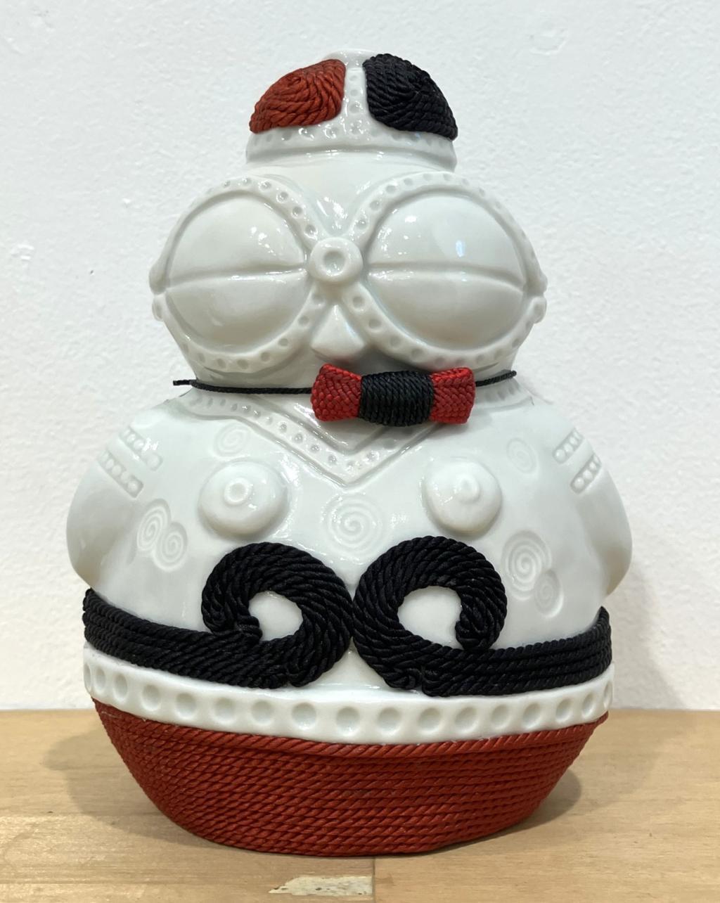 陶土で成形した縄文火焔式土器の表面の紋様をあえて彫り込まず、京組紐で表現しました。