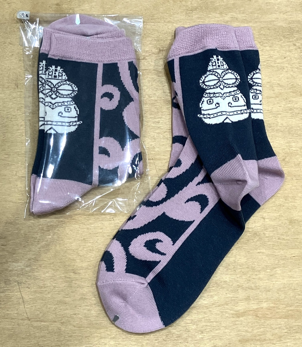 青森の亀ヶ岡文様と遮光器土偶をモチーフにした靴下です。