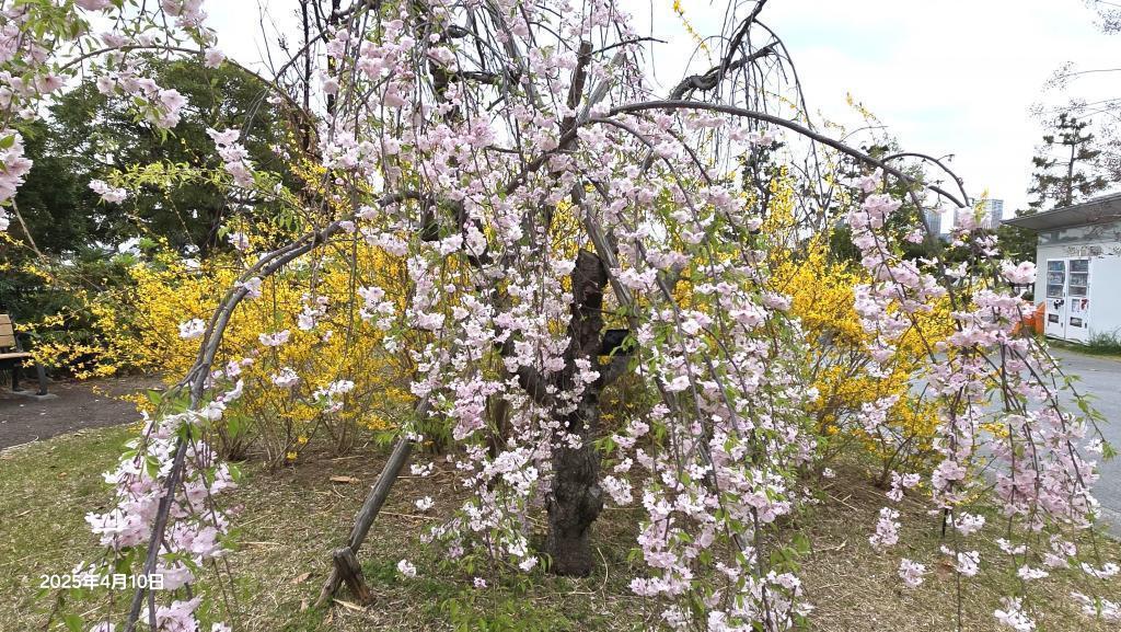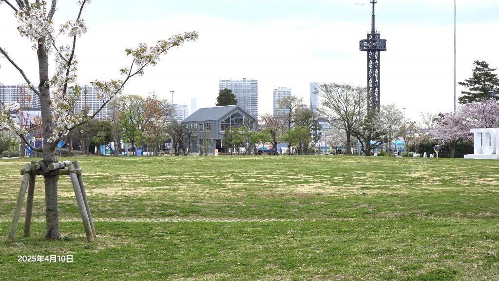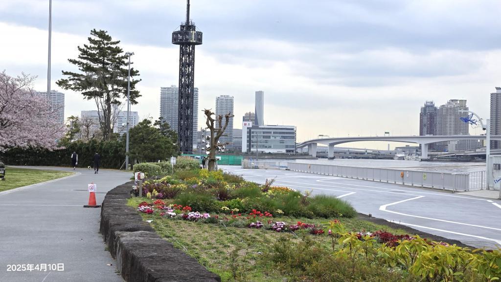 晴海ふとう公園では桜が散りはじめました。そよ吹く海風が桜の花びらを運んでいます。