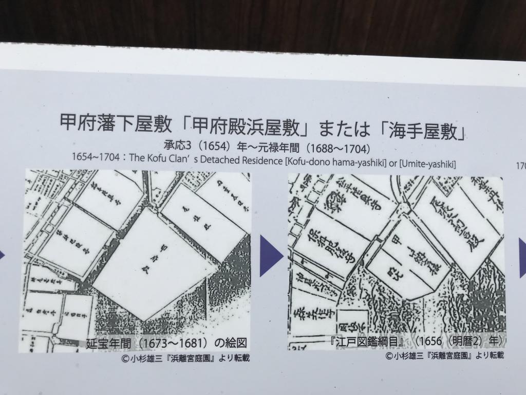承応3年(1654年)、甲府藩主の松平綱重が、兄の4代将軍徳川家綱から現在の浜離宮の場所に邸宅を与えられ、江戸湾の一部を埋め立てて下屋敷を建てました。ここは、「甲府殿浜屋敷」「海手屋敷」と呼ばれました(写真)。さらに綱重の子、綱豊が6代将軍家宣になってからは「浜御殿(はまごてん)」と称される将軍家の別邸になりました。
