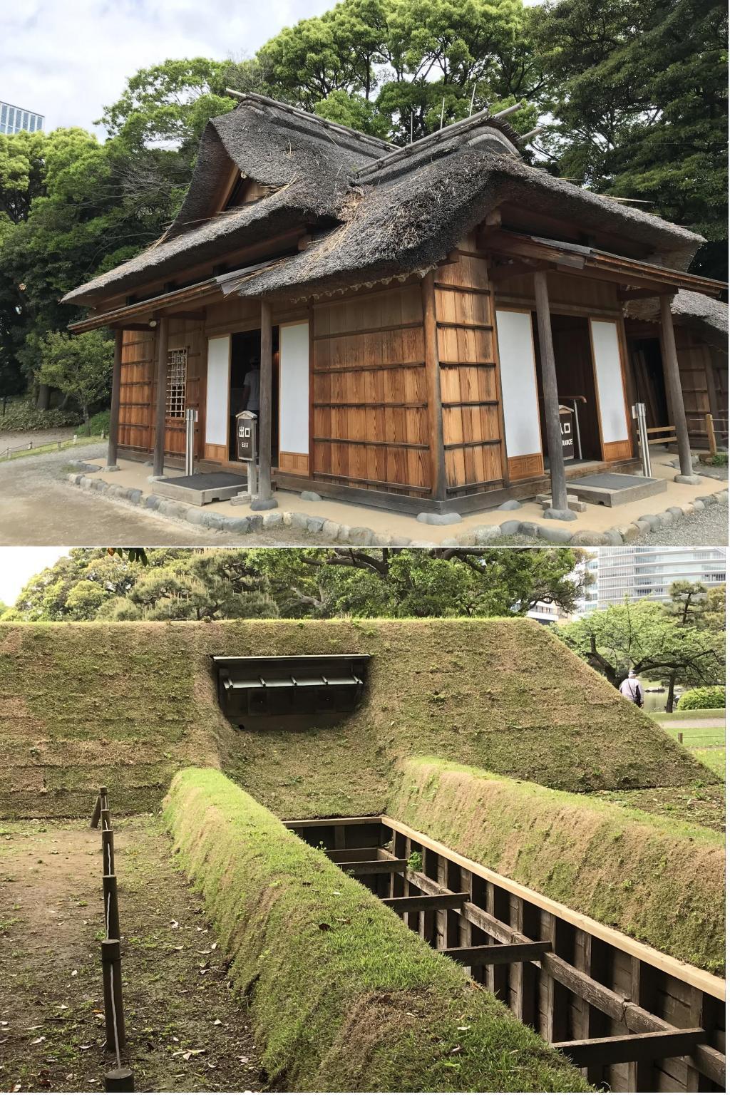 浜離宮では、戦災で焼失した「鷹の御茶屋」(写真上段)が平成30年に復旧され、見学することができます。将軍が鷹狩の合間に野支度のまま立ち寄れるように広い土間があり、建物の裏には、鷹が待機するための「鷹部屋」があります。