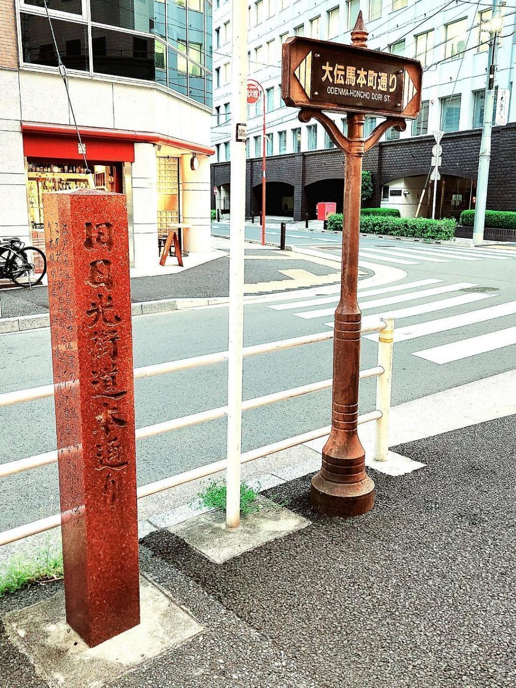 宝田恵比寿神社のあるえびす通りから大伝馬本町通りに入る左角に「旧日光街道本通り」碑(日本橋大伝馬町2-1)があります。
