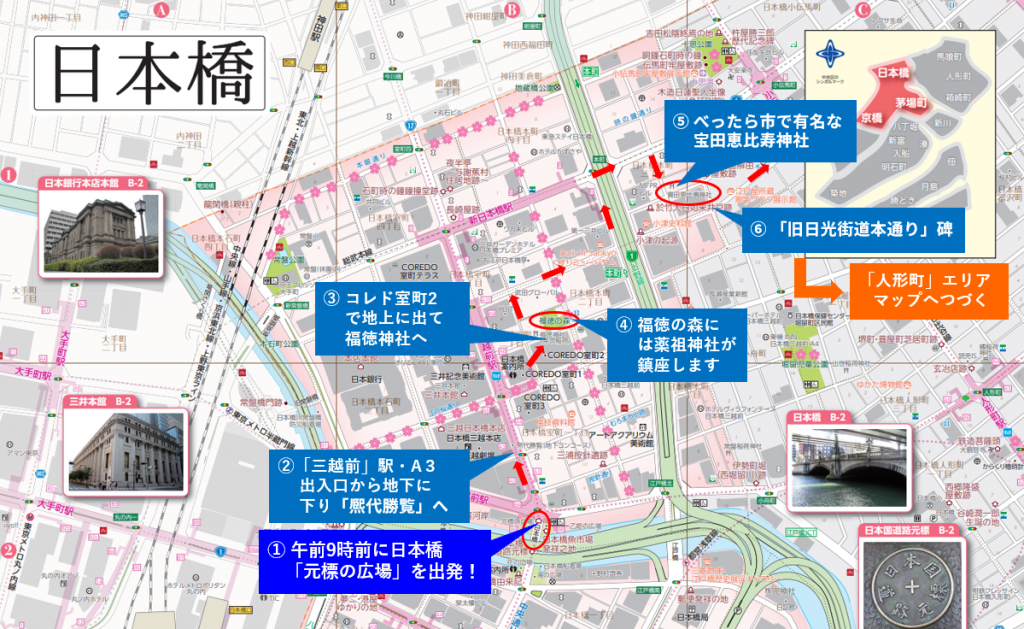 まずは、日本橋エリア(日本橋「元標の広場」~「旧日光街道本通り」碑)です。