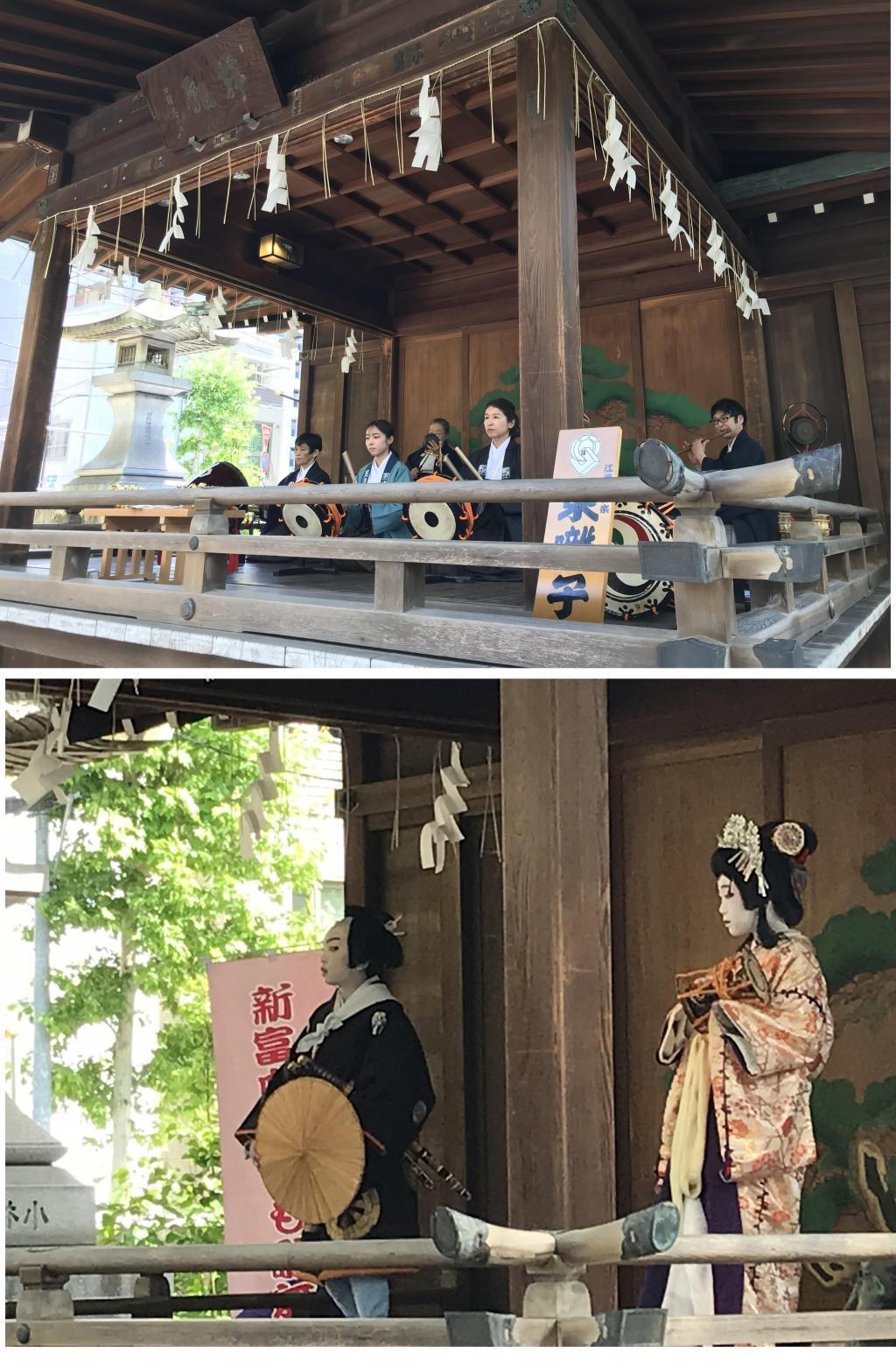 5月4日は、朝9時から「鐵砲洲東囃子御奉納」と、夕方には「神楽舞奉奏」が執り行われました。また、こどもの日の5月5日には、中央区内の小学生による「新富座こども歌舞伎」が披露されました。