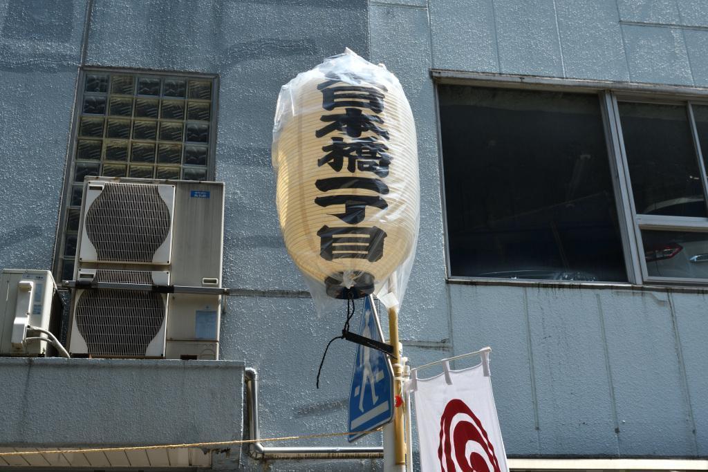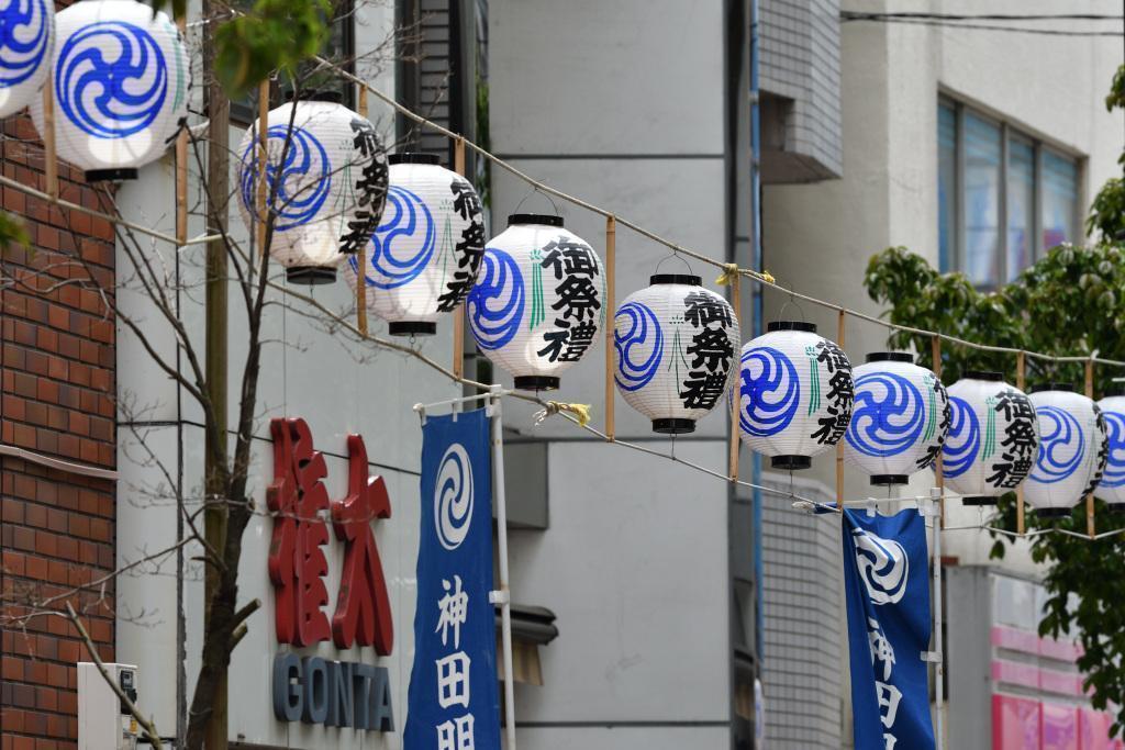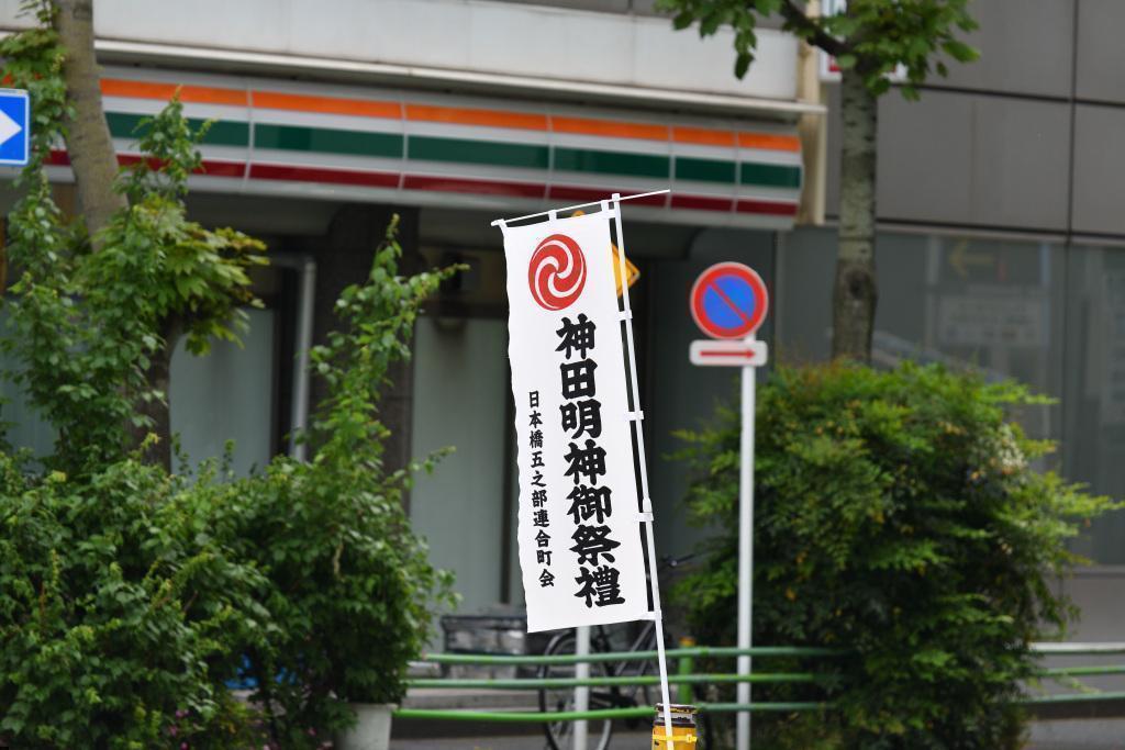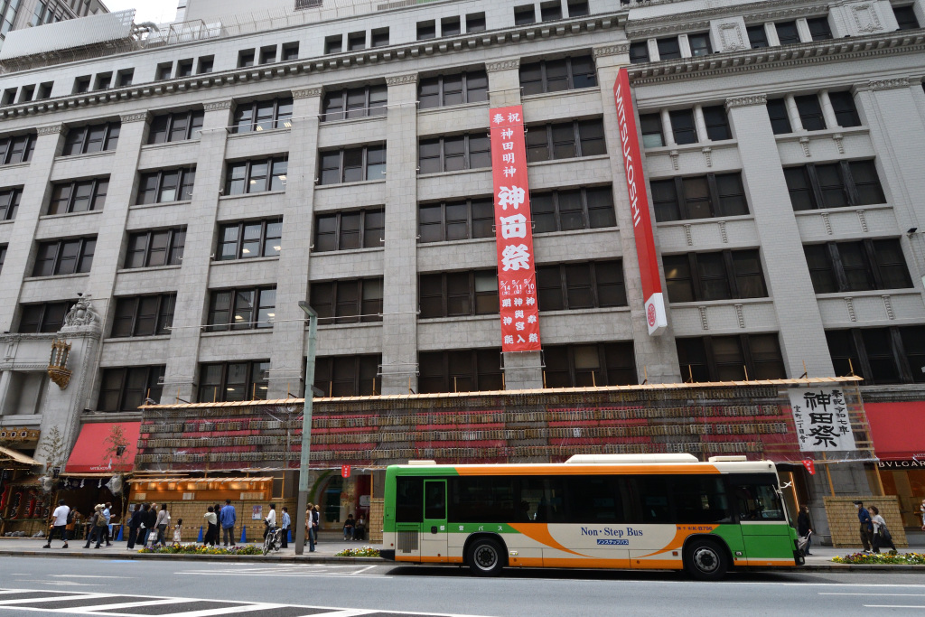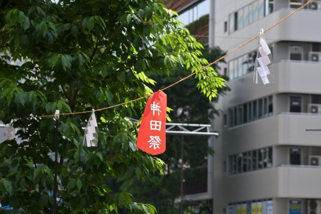 A banner "神田祭" for the Kanda Matsuri hangs from a department store.