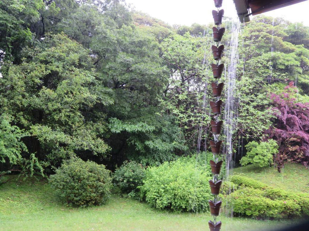 和風建築にみられる竪樋[たてどい:屋根の軒から地面に向かって雨水を流す鎖状のもの]が下がっています(写真)。今日はデザイン性より実用の日となりました。