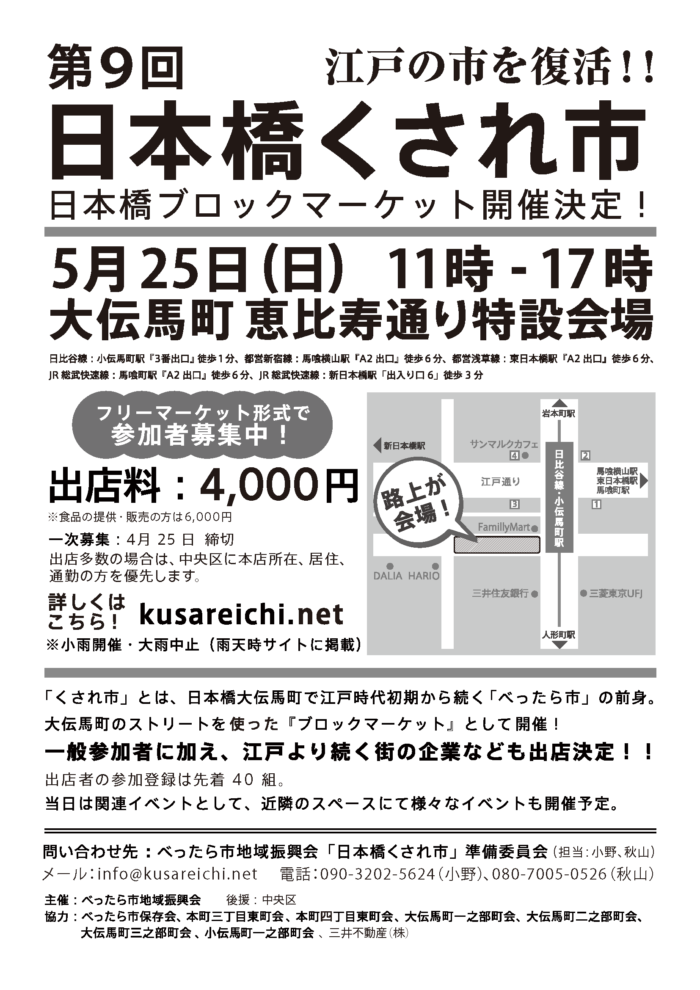 来たる5/25(日)に置きましては、日本橋大伝馬町において「第9回 日本橋くされ市」が開催されます