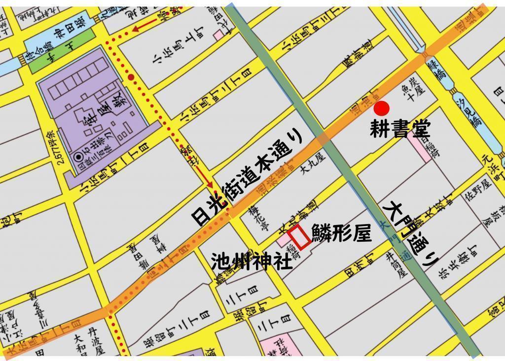この「池州稲荷大明神」、現在も日本橋堀留町2丁目に「池州神社」が残っています。江戸時代の地図では、池州神社は日光街道本通りの一本南東の大丸新道沿いにあり、その隣が鱗形屋だったと考えられます。