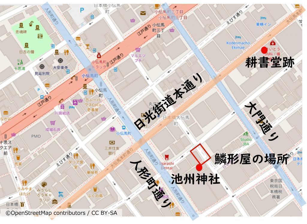 現在地図に当てはめてみると、鱗形屋の位置は下の地図の場所になります。