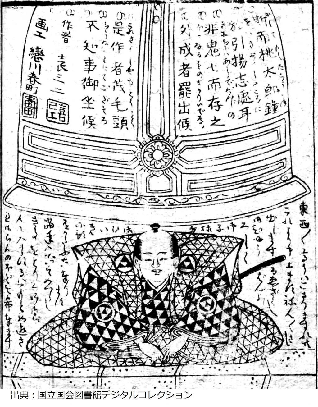 下の絵は、安永6年(1777)に刊行された朋誠堂喜三二/作、恋川春町/画の『桃太郎後日噺』に出てくる鱗形屋孫兵衛です。裃を着た孫兵衛が「東西、東西」と口上を述べている姿です。