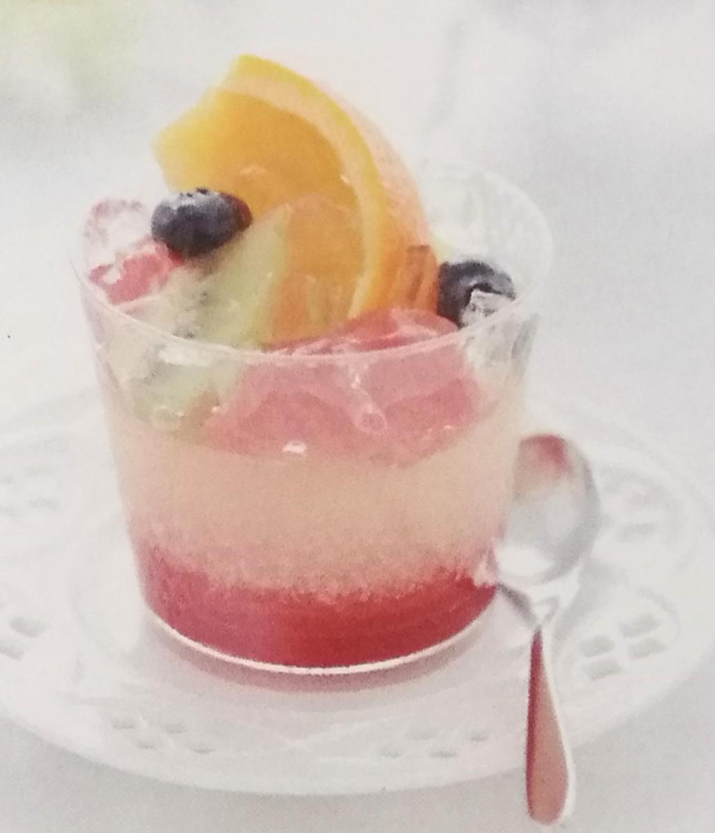 ナタデココを閉じ込めたベリーゼリーと瀬戸内レモンゼリーの甘酸っぱい組み合わせ。
