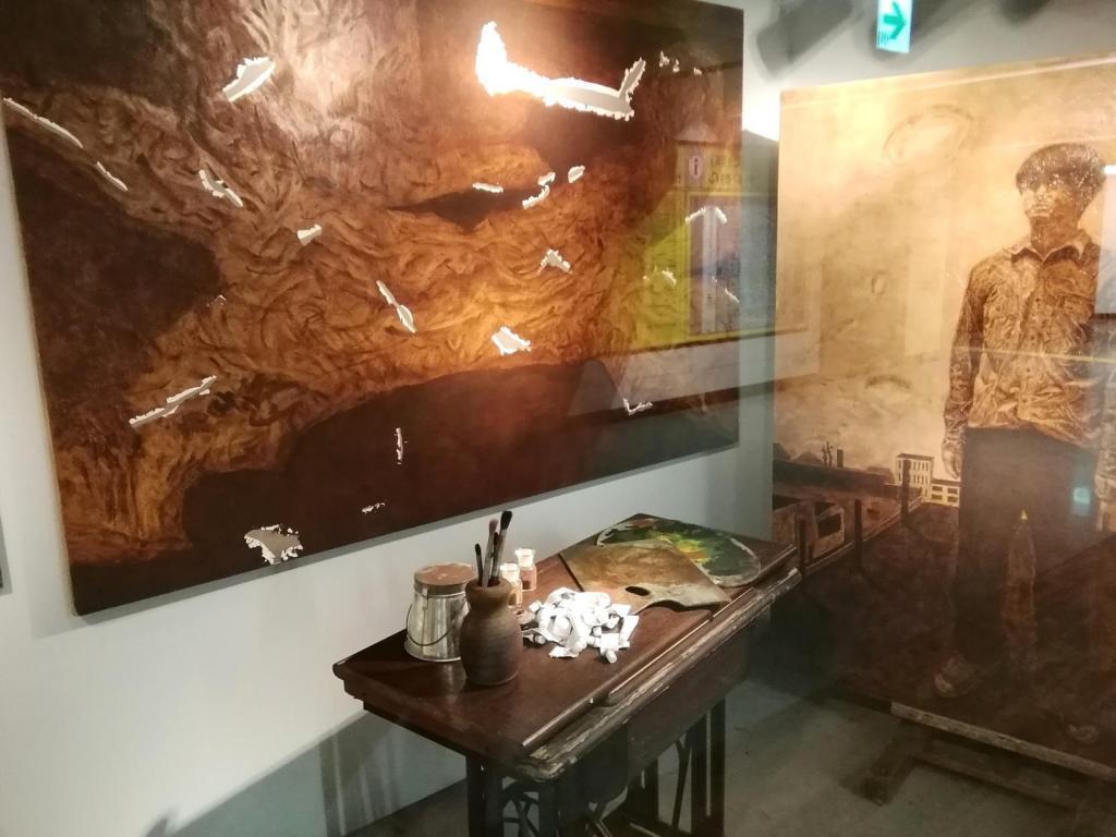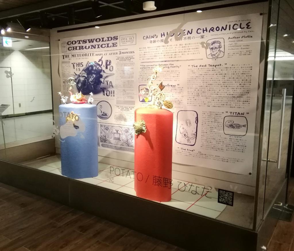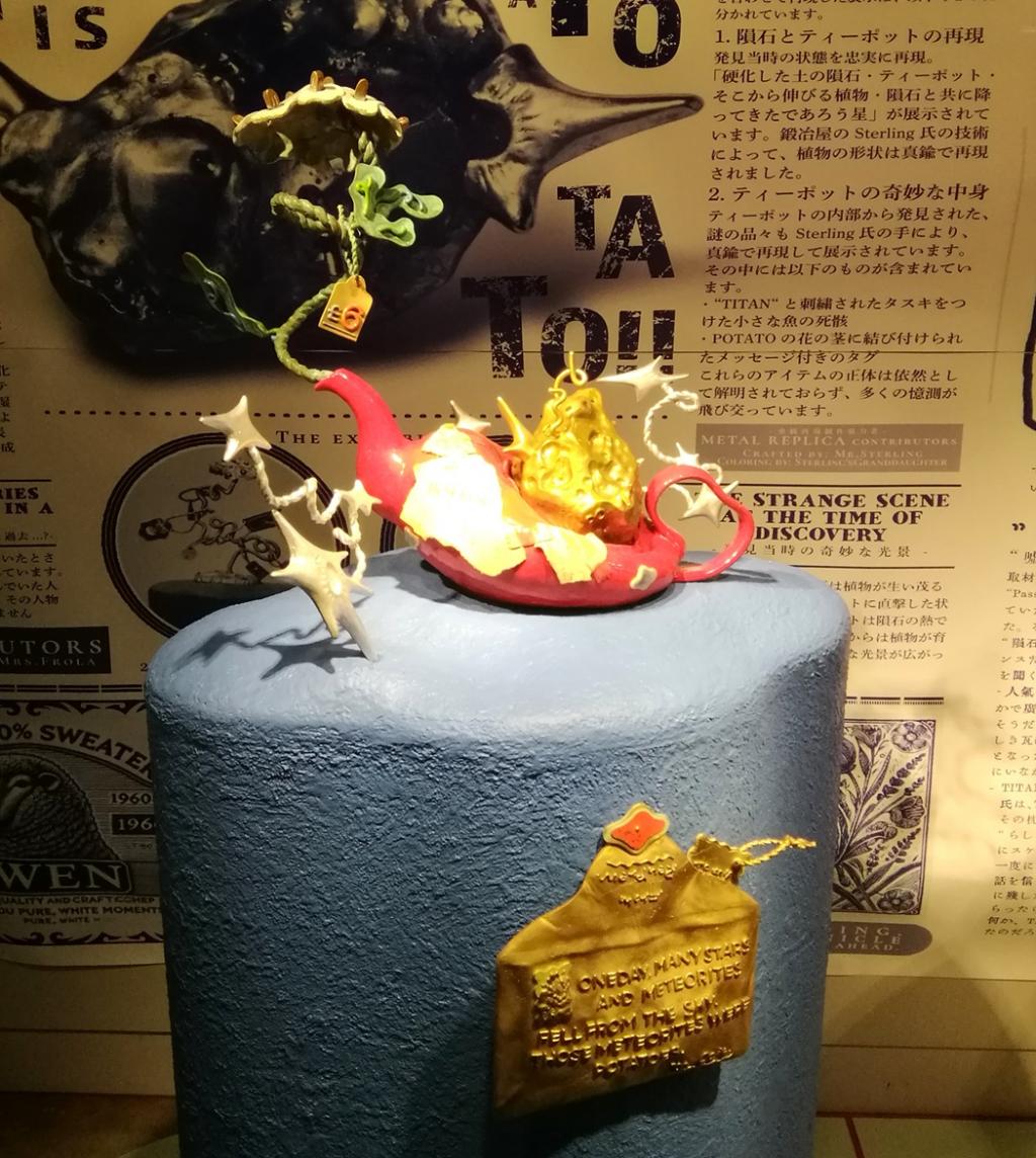 これは突如降り注いだ石とその状況を再現した展示であり、ポットと隕石は現場にあった実を忠実に再現したもの、右の真鍮で制作した像はポットの中身を2倍スケールで再現している。