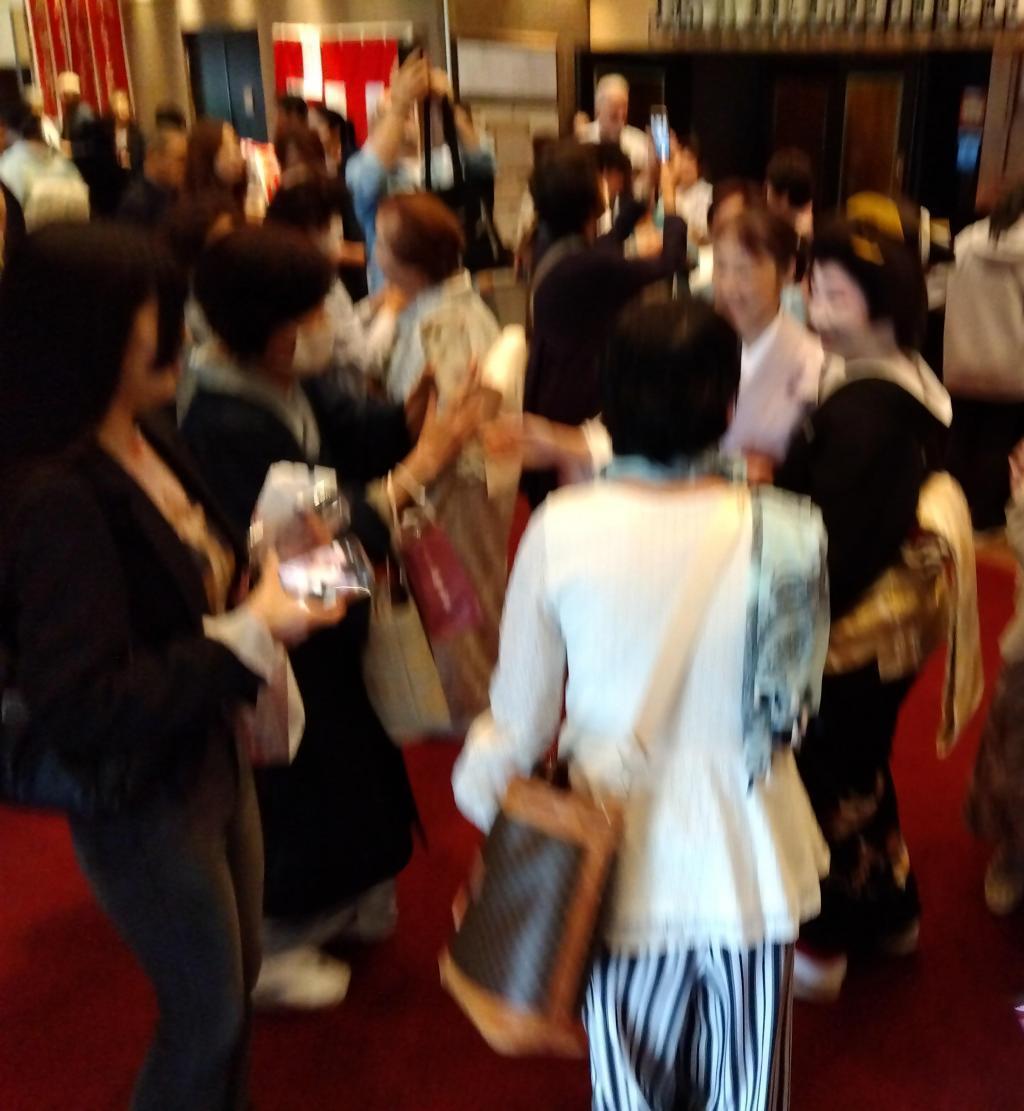 皆さん、美しい踊りの余韻に浸っていましたが、ロビーに出て、芸者さんとの歓談で弾んでいます。