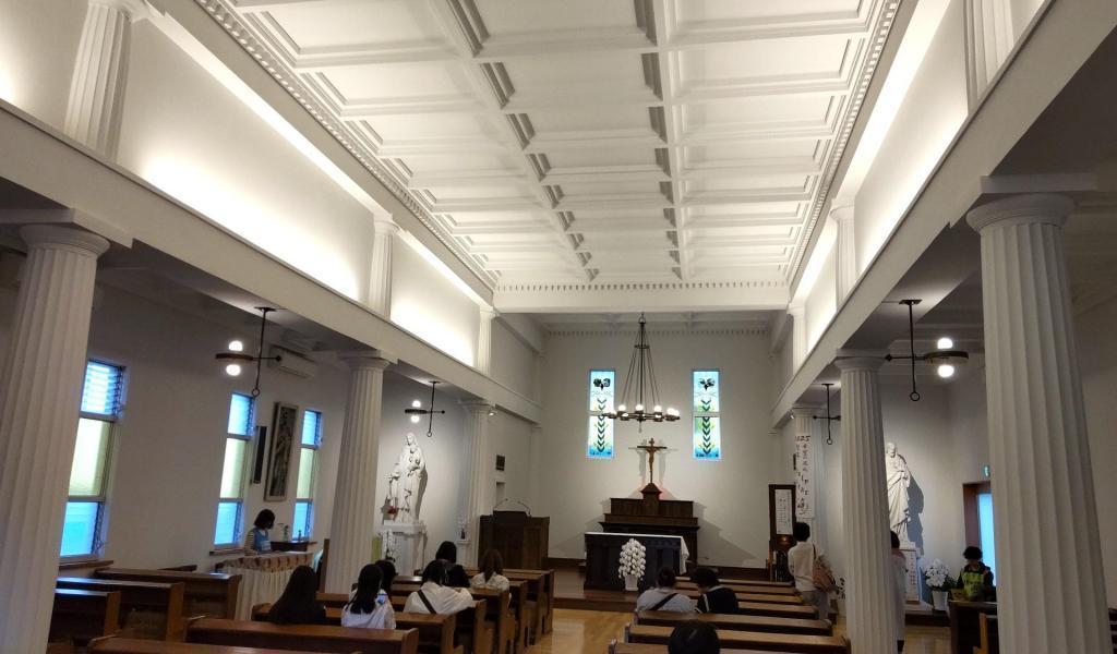 ステンドグラスというと、赤色系が中心に来るイメージがあるのですが、白色の壁面・柱に青色系の光も美しく映えるものです。