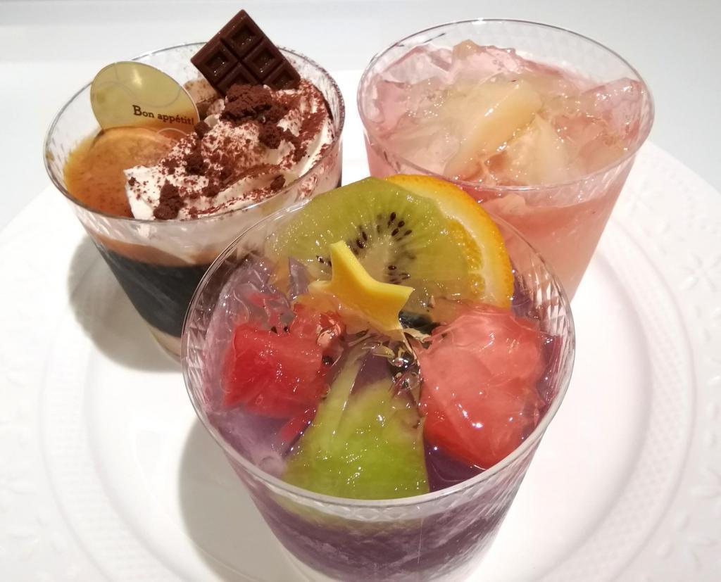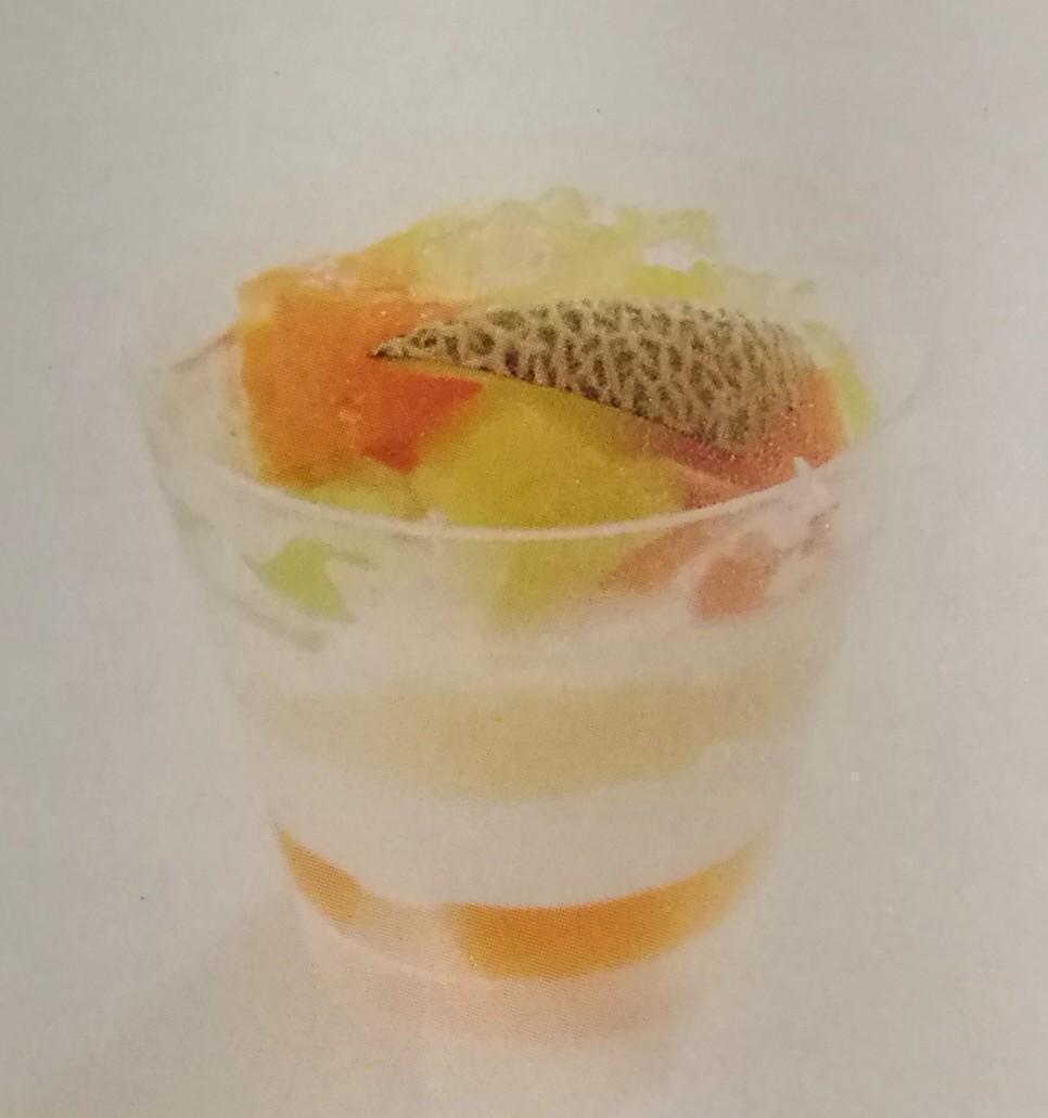 みずみずしいフルーツと、ヨーグルトムースにブルーハーブエキスシロップゼリーの爽やかな涼菓。