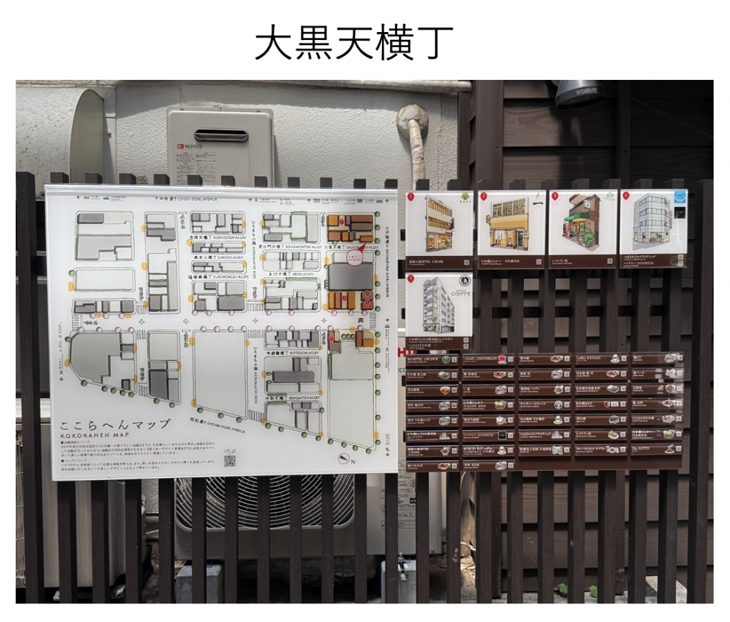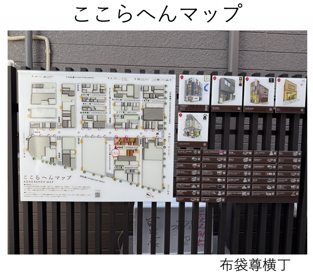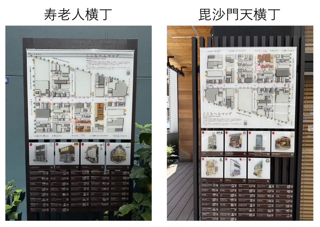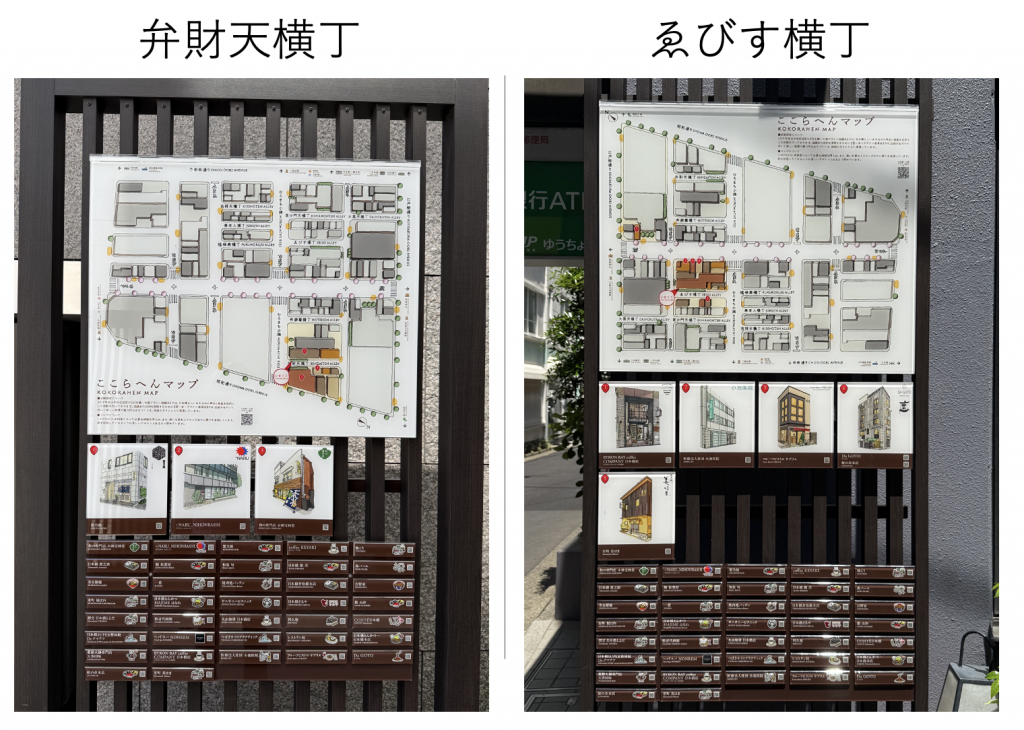前回までに横丁に七福神にちなんだ名前が勢揃いしたことに加え、8つ目の横丁として吉祥天横丁が整備されたことを報告しましたが、現在は横丁に新たに「ここらへんマップ」という案内看板の整備が進んでいました。