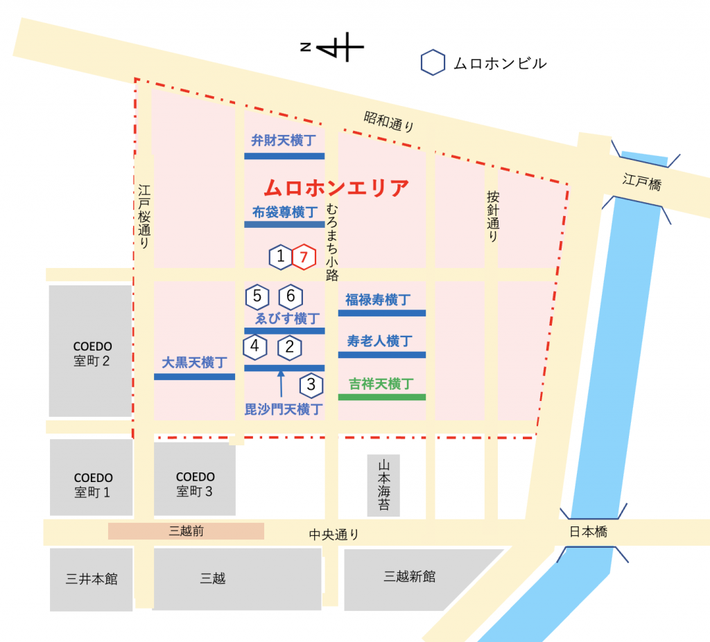 ムロホンエリアは東西は昭和通り〜中央通りの一本東側の通り(名称?)、南北は日本橋川に沿う大通り(名称?)〜江戸桜通りに囲まれた地区で、魅力的な横丁が残された貴重な空間です。