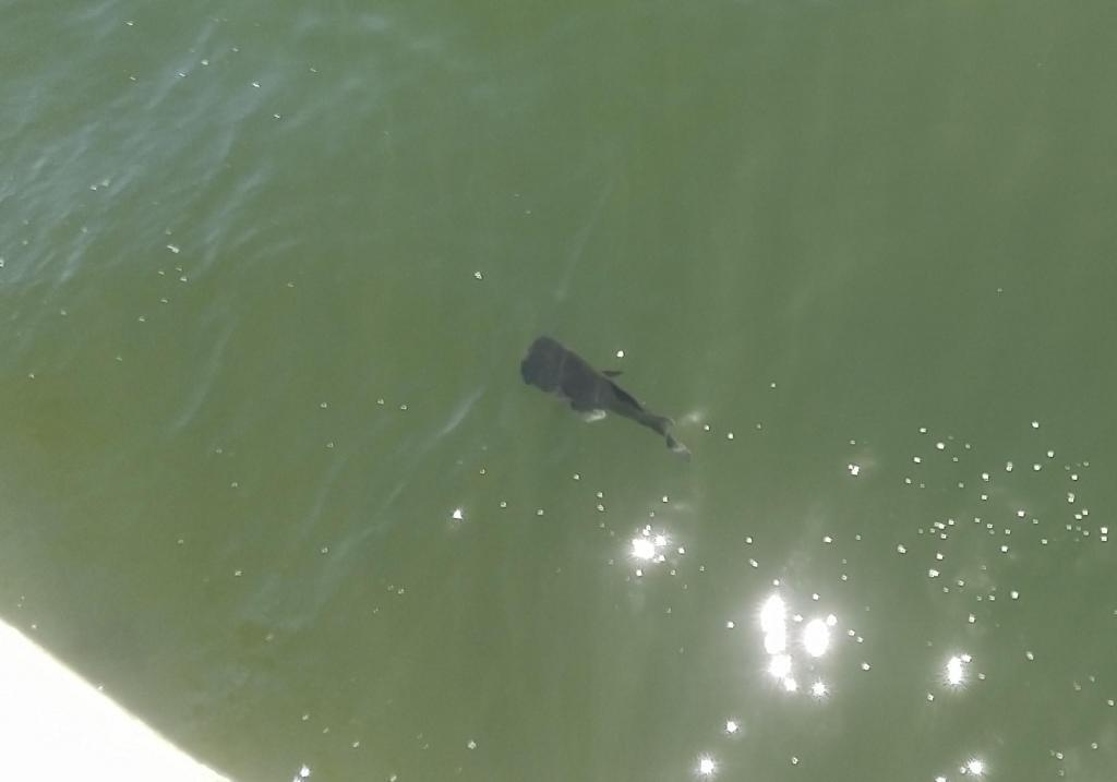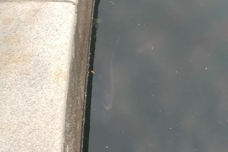 早朝にもかかわらず、もう暑くなっている隅田川の川べり、亀島川の水門近くを愛犬と散歩中、岸近くの水面に背びれらしきものを発見しました。目を凝らしてみるとかなり大きな魚のよう。暑いせいかアップアップといった感じ。これは珍しいとスマホを構えました。