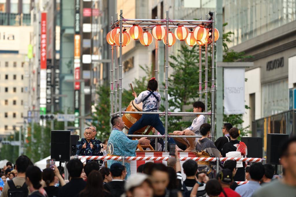 At the heart of the festivities is the Dai-Ginza Bon Odori (Grand Bon Dance), which takes place around a raised stage (yagura) set up in front of Matsuya Ginza department store. There are also food stalls featuring classic flavors from Ginza’s well-known eateries, traditional performances like taiko drumming, photo spots, and even exhibits of patrol cars and fire trucks presented by the Tsukiji Police and Kyobashi Fire Departments.