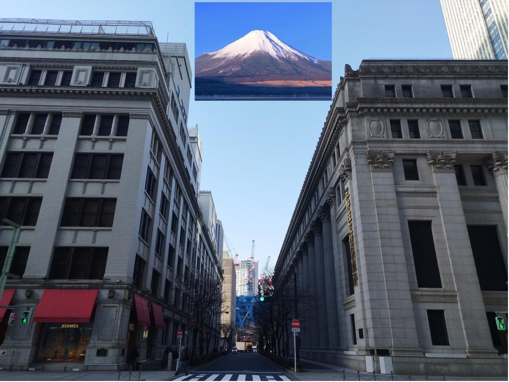写真は、日本橋三越本館(左)と三井本館(右)、その間にある「江戸桜通り」です(富士山は合成)。江戸時代には、正面に富士山を眺めることができ、広重の、「名所江戸百景 するがてふ」に描かれています。