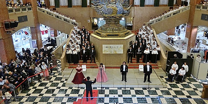 12月29日12:30~/14:30~(各回約25分)、日本橋三越本店 本館中央ホールにて、日本で唯一現存する演奏可能な昭和初期製造のシアターオルガンとして区民有形文化財に登録されているパイプオルガンの伴奏での「三越の第九コンサート」が開催されました。 今回は、指揮者 長堀拓斗氏、オルガニスト 加藤慶子氏、ソプラノ 中須美喜氏、メゾソプラノ 南あかり氏、テノール 大平倍大氏、バリトン 外崎広弥氏の気鋭ソリストを迎え、声楽家と「中央区第九記念合唱団」による大合唱です。 「中央区第九記念合唱団」は、1938年12月 歌舞伎座での、ドイツから招聘したローゼンシュトック指揮 新交響楽団(現NHK交響楽団)第九公演が「年末の第九」の一つの端緒とされている縁を踏まえ、歌舞伎座の全面建て替え構想が浮上する中、「平成の歌舞伎座に70年ぶりに第九公演を復活させよう」と、区内在住·在勤者等により2007年3月結団された三世代参加型「中央区第九の会合唱団」がその前身で、2014年「中央区第九記念合唱団」と改称されました。 1994年設立の中央区交響楽団の全面協力を得、「中央区第九の会」が編成され、2008年4月には念願の歌舞伎座の舞台にも立ち、2008年12月には晴海トリトン公演をスタートさせ、以降毎年師走の恒例行事として、ベートーヴェン作曲交響曲第9番「合唱付き」より 第4楽章「歓喜の歌」が 歌い継がれ、コロナ禍を経て2023年、会場を銀座ブロッサム 中央会館ホールに移し活動再開し、昨年来「日本橋三越第九コンサート」への出演となりました。 国の重要文化財に指定された、5階までの吹き抜け空間に、ベートーヴェンが第九に込めた「全ての人間は兄弟になる」「人類の融和」という平和への祈りの力強い歌声が響き渡りました。 尚中央区第九記念合唱団は、2026年1月24日(土)、晴海トリトンスクエア内第一生命ホールにて2025年度定期公演を開催予定です。
