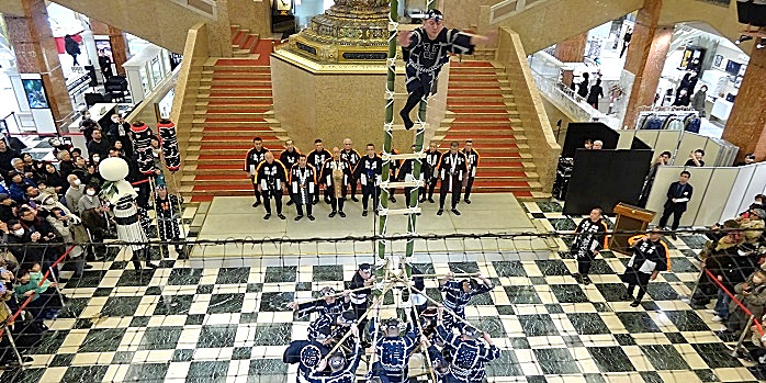 1月2日~4日、日本橋三越本店が一年で最も華やぎ、瑞気に溢れる「新春祭 2026」が開催中ですが、本館中央ホール·本館屋上では「三越縁楽座」と題し、年初めの来店客との ”ご縁" を寿ぐ賑やかなイベントが多彩に展開されています。 4日11:10からは、新春恒例の、江戸消防記念会第一区メンバーによる「木遣り·纏振り·梯子乗り」の妙技が披露されました。 三井口より高張提灯を掲げ入場すると盛大な拍手で迎えられます。最初の演目は「纏振り」。 纏は組の旗印で組により様々な意匠が凝らしてあり、白と黒の二色に統一され、馬簾と呼ばれる垂れ下がった細長い飾りが、振り上げたり回転させると踊ります。軽やかな所作に見えますが、纏の重量は15-20kg前後と重く、かなりの腕力が必要とされるようです。 続いて僅か12本の鳶口のみで支えられた梯子の上で火事場を探す所作などが盛り込まれた、頂上技、途中技、わっぱと称される種々の大迫力の演技が披露される「梯子乗り」。 梯子の上段から「あけましておめでとうございます」と書かれた垂れ幕を掲出後、地上3間半(約6.3m)の不安定な梯子の上で、次々と繰り出される妙技は圧巻の一言です。 最後に「木遣り(唄)」の披露。 何れも正月らしい、江戸情緒溢れる、粋で鯔背な伝統のパフォーマンスです。 江戸消防記念会は、江戸期の町火消、明治期の消防組の後裔として、昭和14年に結成され、伝統と文化を今に受け継ぎ、第一組は中央区全体と千代田区の一部を、内二番組(い組)から十番組(千組)が中央区所管と聞きます。