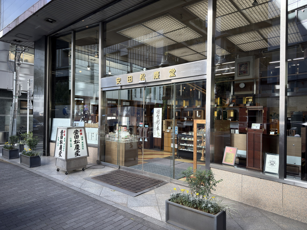 展示品には、こうした安田松慶堂ゆかりの品々が並んでいます。戦災により多くの資料が失われたため、展示数は決して多くはありませんが、いずれもお店の歴史を感じさせるものです。