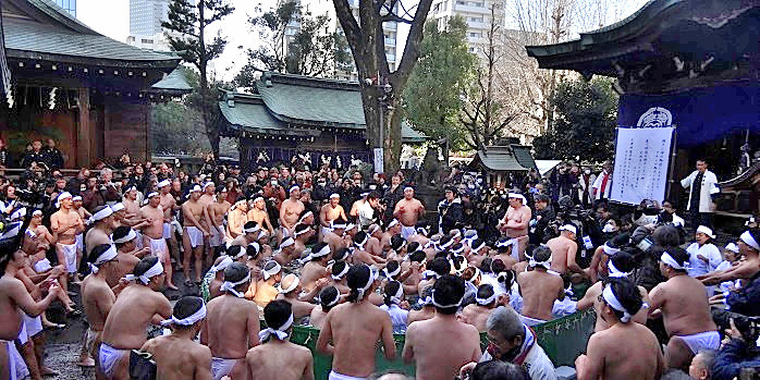 1月11日10:30~、鐵砲洲稲荷神社境内にて、今年で71回目となる新春恒例の「寒中水浴大会(寒中禊)」が執り行われました。 毎年正月第2日曜日に行われる寒中水浴は、新年に神前で冷水を浴びて心身を清める禊を行って無病息災を祈願する神事です。 かつて寒垢離や寒禊と呼ばれ、江戸時代発祥とされる年初めの心身浄化·錬成行事で、昭和30年、先代宮司により「寒中水浴大会」として復活した、神道の伝統行事を今に受け継ぐ祭礼です。 今年の参加者は女性16名を含む総勢98名で、白鉢巻きに、男性は白色越中褌、女性は白装束姿です。 中川宮司、来賓、弥生会会長の挨拶、記念撮影の後、東京都神社庁錬成行事道彦(=導師)篠直嗣 板橋氷川神社宮司の指導の下、川面(カワツラ)流の禊行法で行われます。 まずは公道に出て「エイッ、サッ!、エイッ、サッ!」掛け声高く、神社一周ランニング。 次いで拝殿前に掲示された和歌三首を唱えながら船を漕ぐ所作「鳥船」、下腹に力を入れ雄叫びを上げる「雄健(オタケビ)、二本の指で邪気を斬る所作「雄詰(オコロビ)、両手を開き上に伸ばす深呼吸法「氣吹(イブキ)」などの行を行います。これらは身体の邪気を発散させ、心と霊魂を浄化統一する作法とされます。 そしていよいよ京橋氷業㈱奉納の36貫(135kg)の氷柱2本入りの直径5m深さ0.8mの水槽に入水し、神道における祓いを司る神々「祓戸大神(ハラエドノオオカミ)」を幾度となく唱え、腹の前で玉子を抱くように両手を上下に重ね、胸から腹にかけ上下に揺り動かす「振魂(フリタマ)」の所作をしながら、心身を祓い清めます。一陣二陣に分け交互に入水し、上がると水槽の周りに立ち、再度整理運動を兼ねた鳥船等の行を行い、最後に柏手を打ち、寒禊を終えます。 神楽殿では、鐵砲洲囃子の奉納演奏が行われ、拝殿左手脇では、温かい甘酒が振る舞われています。