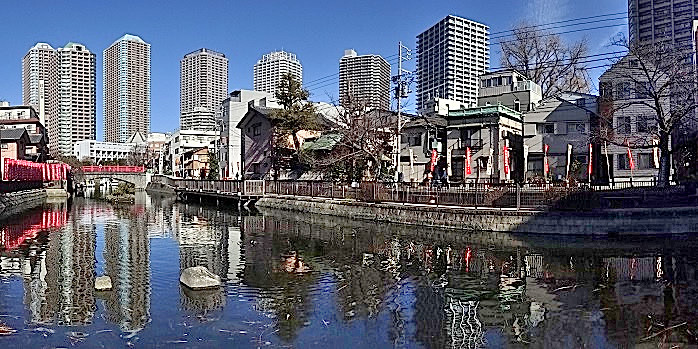元佃エリアには、壱部(上町)に、住吉神社境内社の一つで明治2年に大伝馬町1丁目より遷座したと伝わる「入船稲荷神社」、弐部(下町)に、森孫右衛門一族が奉納した屋敷神が起源の「森稲荷神社」、参部(東町)に、玉垣の刻銘に元漁師町の面影を残す「浪除稲荷神社·於(御)咲稲荷神社」と、計3ヵ所4社の稲荷神社が鎮座しています。 初午祭とは、和同4年2月の最初の午の日、全国に約3万社とされる稲荷神社の総本山である京都伏見稲荷大社に祭神が降臨したとの故事に由来した、2月初午に斎行される稲荷神社の祭事です。 今年は暦通り、初午の2月1日(日) 10:00から、太鼓の音が響く中、参部、弐部、壱部の順で、住吉神社平岡宮司により、修祓式が執り行われました。 神前には、油揚げのほか、酒、海の幸、山の幸などの神饌が供えられ、前日、佃住吉講により整然と立てられた、神社前の幟、周辺の数多くの奉納旗が、風に閃き、青空の下 舟入堀に映り込み、風情ある景観を醸し出しています。 境内には、江戸時代に遡る風俗の「地口」(駄洒落の一種で、誰もが知る成句や芝居の台詞などを置き替えた言葉遊び)に滑稽な画を描き加えた、風刺とユーモアが融合した「地口行灯」が飾られています。「ゑん満舌の力もち(=縁の下の力持ち)「大竹のみ(=大酒呑み)」「かむろの月見(=鮪のすき身)」「傘へ穴あけ半でのいなり(=葛西金町半田の稲荷)」等々、軽妙な笑いを誘います。