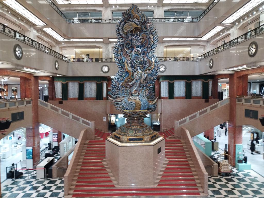 日本橋三越本館1階には、90周年となる「中央ホール」があり、高さ約11m(台石除く)の「天女像」が設置されています。三越のお客様に対する基本理念「まごころ」をシンボリックに表現する像として「まごころ像」ともいわれ、日本橋三越本店の象徴ともいえる存在です。