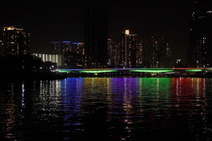 湊・明石町と佃・月島を結ぶ佃大橋では欄干の下部に一筋の照明が設置されていますが、その光が反射して隅田川の水面がオリンピックカラーに染まる姿が大変美しいです!