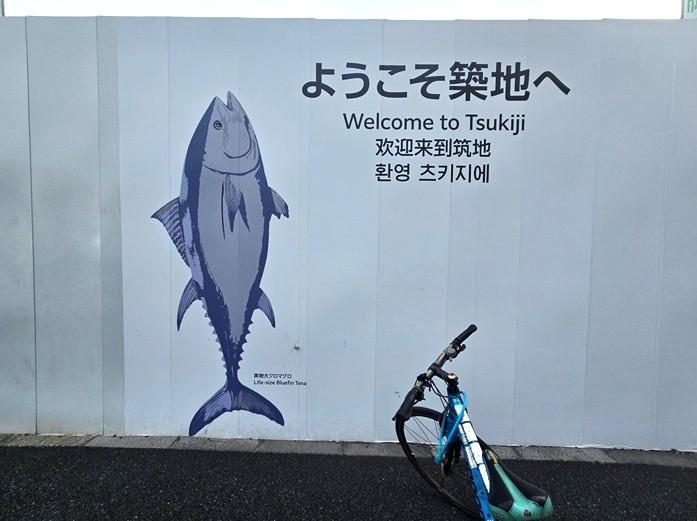 旧築地市場が現在工事中でフェンスに囲まれていますが、この場所に実物大クロマグロの大きさを示すとっておきの絵が飾ってありました。自転車をそばに置いて比べるとクロマグロの大きいこと。とても参考になるので皆さんにお知らせします。