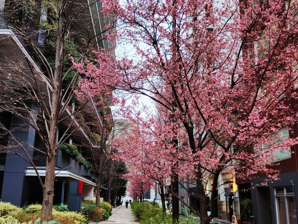 高層ビルの傍らで、一足早く春の訪れを告げる河津桜とオカメザクラ、この競演がみられる貴重な場所となっています。