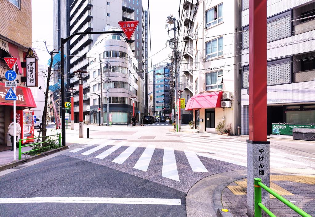 最初の三差路を左に折れると、少し先に、小さな裸電球を軒下に並べ、暖色系のファサードを纏った小さいお店が目に入る。通りの両側にオフィスビルやマンションが並んでいるだけに、その明るい色に引き付けられるように前に進む。すぐに変形(直角に交わっていない)三差路。次には変形五差路(直角でなく、かつ交差する地点がずれている)。さらに進むと変形(直角でない)四差路。ほどなく、そのお店にたどりついた。ラーメン屋さんだ。もしこのお店がある交差点が 直角に交わり、かつ交差点の向こう側の通りの幅がこれほど狭くなければ、今歩いてきた道からは角に来るまで見えなかったはずの店。絶妙なポジション。そのままそのお店と交差点を通り過ぎ、細くなった道を進み かぎ型に曲がれば 清洲橋通り。左に少し進めば、大小6本の道が、2つの五差路と1つの四差路、1つの三差路(見ようによっては、1つの五差路と1つの四差路、3つの三差路)を構成した東日本橋交差点に出る。(写真の右手奥に伸びる道の右側に東日本橋2丁目、正面中央の高いビルの奥側に東日本橋3丁目の味わい深い交差点が潜んでいる。)