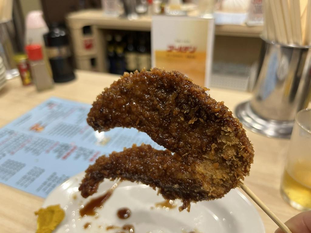 薄くスライスされた豚レバーに衣をつけてカラッと揚げられ、さっとウスターソースに潜らせてます。衣に含まれた油の旨みと、ソースの味でレバーの臭みは感じません。レバーと言われないと素材がレバーって事に気がつかないかもしれません。
